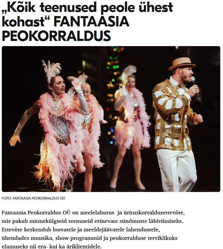 Fantaasia Peokorraldus koondab kogenud artiste ja teenusepakkujaid, kes osutavad kvaliteetseid ja usaldusväärseid teenuseid Teie sündmustele ausa hinna eest. Lehekülg on loodud selleks, et pakkuda mugavat artistide ja teenuste tellimise lahendust igale sündmusele. Peokorraldus jätke meie hooleks!